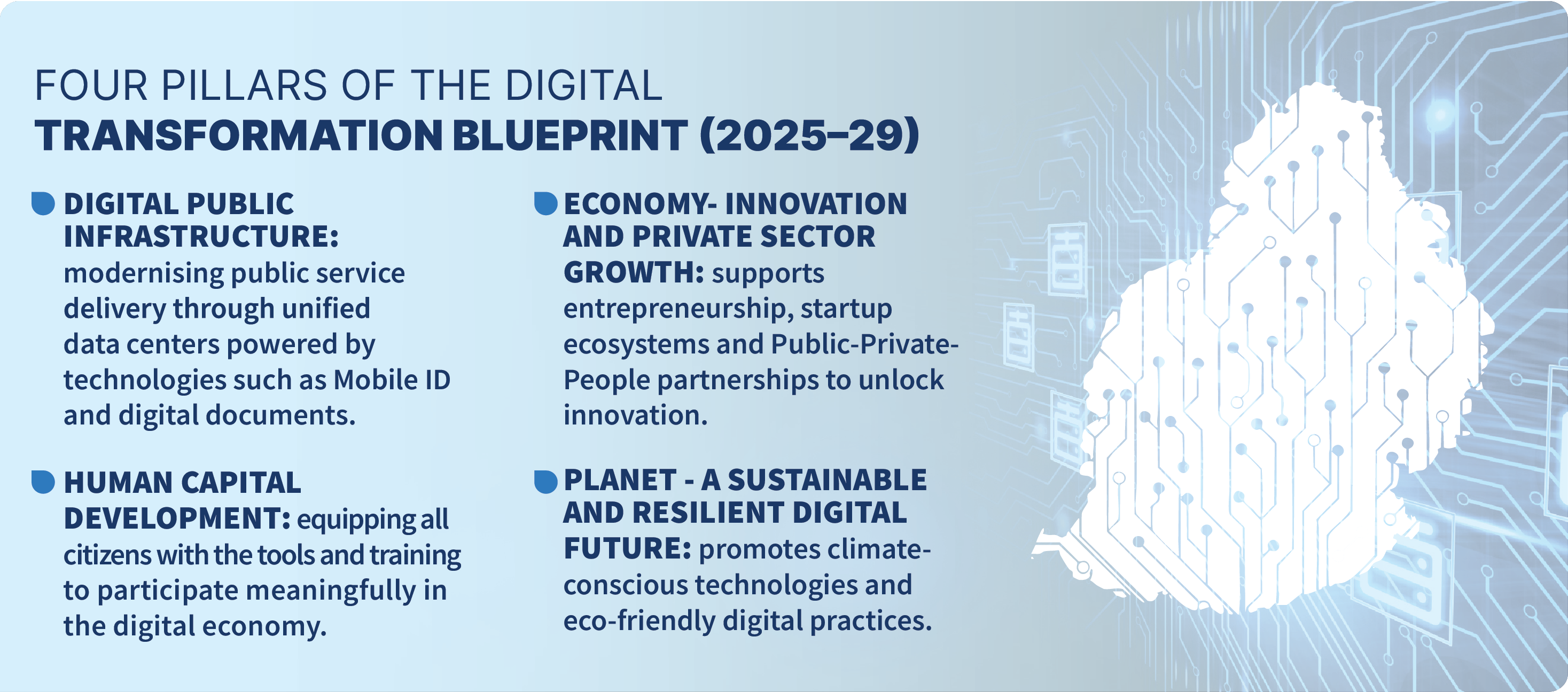 Building on this connectivity, the government is now establishing a robust Digital Public Infrastructure that will underpin all future digital services. Unified digital identity, secure data-sharing platforms and interoperable government systems are designed to simplify interactions for citizens and businesses, reduce duplication and enable mobile-first access. A single government portal and planned “super app” will bring services together under one digital roof, reinforcing efficiency while improving user experience.